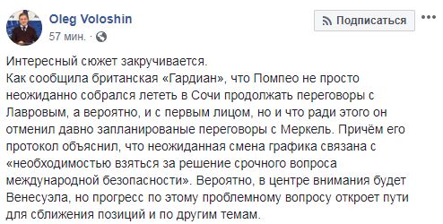 "Интересный сюжет закручивается. Как сообщила британская "Гардиан", что Помпео не просто неожиданно собрался лететь в Сочи продолжать переговоры с Лавровым, а вероятно, и с первым лицом, но и что ради этого он отменил давно запланированые переговоры с Меркель. Причём его протокол объяснил, что неожиданная смена графика связана с "необходимостью взяться за решение срочного вопроса международной безопасности". Вероятно, в центре внимания будет Венесуэла, но прогресс по этому проблемному вопросу откроет пути для сближения позиций и по другим темам", - пишет в Facebook Олег Волошин.