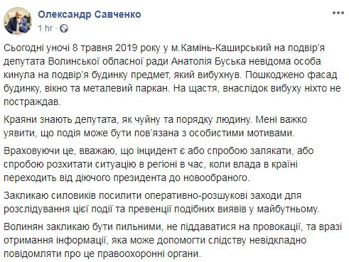 "Сегодня ночью, 8 мая 2019 года, в г. Камень-Каширский во двор депутата Волынского областного совета Анатолия Буска неизвестный бросил предмет, который взорвался", - написал Савченко.