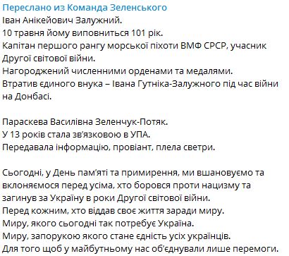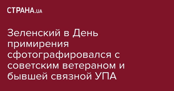 Новоизбранный президент Украины Владимир Зеленский в День примирения, 8 мая, опубликовал фотографию вместе с награжденным  участником Второй мировой войны, капитаном первого ранга морской пехоты ВМФ СССР Иваном Залужным и Прасковьей Зеленчук-Потяк, которая в 13 лет стала связной в УПА, передавала информацию и провиант. "Фото примирения" Команда Зеленского выложила в Telegram.
