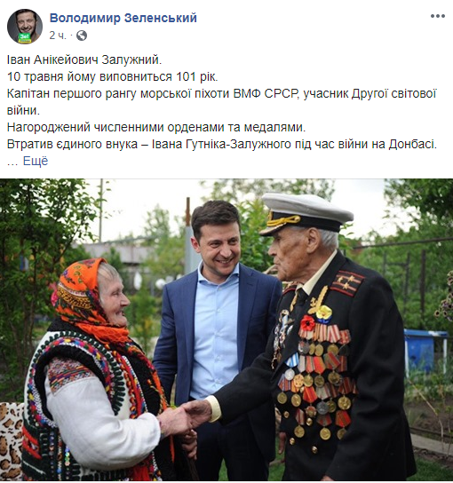 "Иван Аникеевич Залужный. 10 мая ему исполнится 101 год. Капитан первого ранга морской пехоты ВМФ СССР, участник Второй мировой войны. Награжден многочисленными орденами и медалями. Потерял единственного внука - Ивана Гутника-Залужного во время войны в Донбассе.