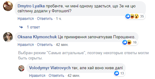 В комментариях одни пользователи предположили, что Зеленского на фото добавили с помощью фотошопа, другие, что примирение начал Порошенко. "Да, но пусть оно живет дальше" - отреагировал Вятрович.