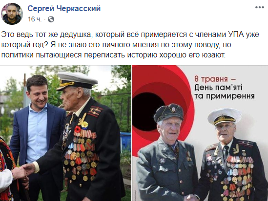 Правда, пока лицом примирения стал только один советский ветеран. И, если еще пару лет назад он фотографировался с Петром Порошенко, то сегодня - жмет руку функционерам УПА рядом с Владимиром Зеленским. А глава Нацпамяти Владимир Вятрович, который предлагает перенести выходной день с 9 на 8 мая, назвал такую риторику нового  президента правильным подходом.