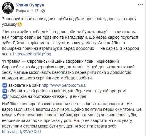 Глава Минздрава Ульяна Супрун, которая ранее уже объяснила украинцам, когда нужно избавляться от зубов мудрости, на сей раз рассказала, что для здоровья десен и всей ротовой полости главное не откладывать визит к стоматологу до последнего и не забывать о правилах гигиены.
