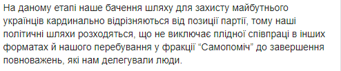 Войцицкая отметила, что на данном этапе "наше видение пути для защиты будущего украинцев кардинально отличается от позиции партии". "Поэтому политические пути расходятся, что не исключает плодотворного сотрудничества в других форматах и нашего пребывания во фракции "Самопомощь" до завершения полномочий, которые нам дали люди", - добавила она.