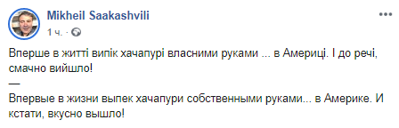 Бывший президент Грузии и экс-губернатор Одесской области Михаил Саакашвили рассказал, как впервые в жизни испек хачапури. Соответствующий пост он выложил на своей странице в Facebook.