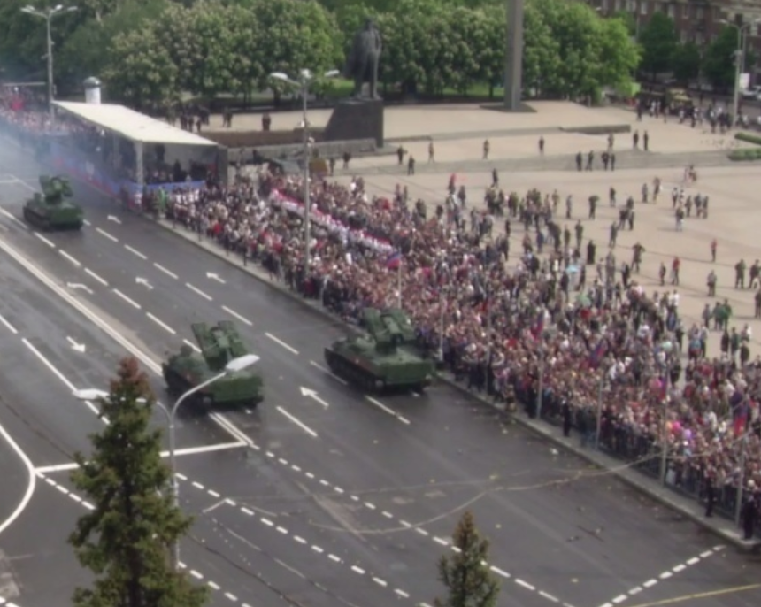 Так, в Донецке по центральной улице Артема прошли 1,5 тысячи "ДНРцев", а также около 60 единиц техники, в том числе и времен Второй мировой войны (РСЗО "Катюша", САУ Су-100, грузовик ГАЗ-АА "Полуторка"). Однако были там и более современные российские образцы: танки Т-64 и Т-72, БМП, РСЗО "Град" и многое другое.