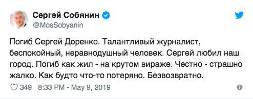 "Погиб Сергей Доренко. Талантливый журналист, беспокойный, неравнодушный человек. Сергей любил наш город. Погиб как жил — на крутом вираже. Честно — страшно жалко. Как будто что-то потеряно. Безвозвратно", - написал Собянин в Twitter.