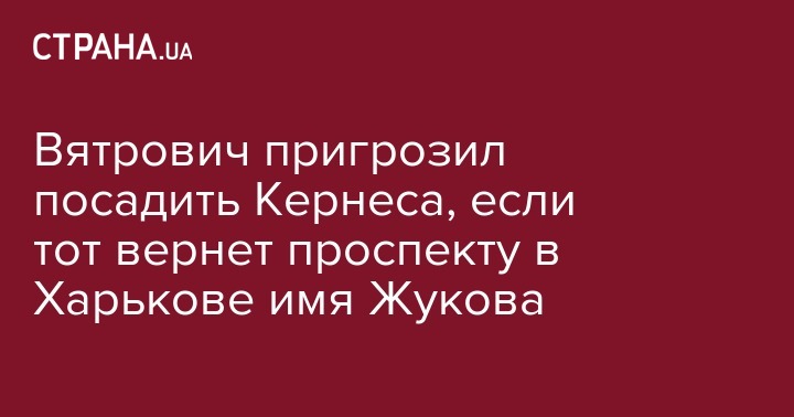 "Возможное присвоение любому объекту права собственности (объекта топонимики) в г.Харькове имени Георгия Жукова будет противоречить требованиям части шестой статьи 3 Закона Украины "О присвоении юридическим лицам и объектам права собственности имен (псевдонимов) физических лиц, юбилейных и праздничных дат, названий и дат исторических событий", - говорит Вятрович, комментируя намерения Кернеса удовлетворить петицию о возвращении харьковскому проспекту имени Жукова.