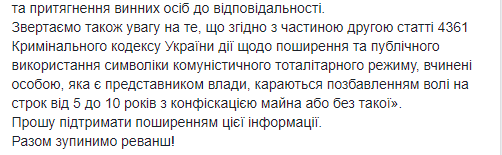 Председатель институт напомнил, что нарушение закона о декоммунизации представителем власти наказывается лишением свободы на срок от 5 до 10 лет. "Вместе остановим реванш!" - добавил Вятрович.