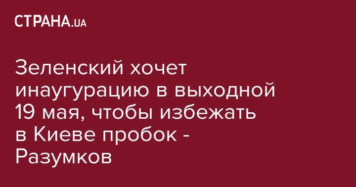 В команде избранного президента Украины Владимира Зеленского предложили провести инаугурацию 19 мая, чтобы свести к минимуму негативный эффект от возможного транспортного коллапса в центре Киева. Об этом заявил советник нового президента Дмитрий Разумков в эфире ток-шоу "Свобода слова" в понедельник.