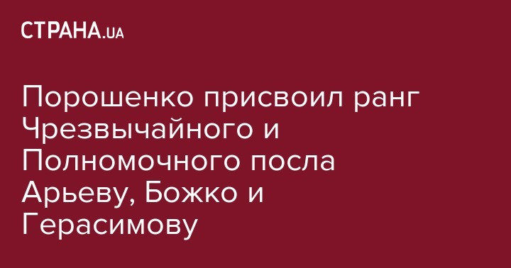 Порошенко присвоил дипломатический ранг Чрезвычайного и Полномочного посла председателю комитета ПАСЕ по вопросам культуры, образования, науки и медиа Владимиру Арьеву, заместителю министра иностранных дел Егору Божко, председателю постоянной делегации Верховной Рады в Парламентской ассамблее ОБСЕ Артуру Герасимову, а также послу Украины в Греции Сергею Шутенко.