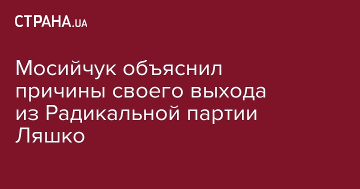 "Хочу сообщить всем о своем выходе из рядов Радикальной партии Олега Ляшко. Это было нелегкое, хорошо взвешенное решение, которое я был вынужден принять. Серьезные идеологические разногласия влекли за собой конфликты с отдельными членами команды. Я не могу идти вопреки собственным убеждениям, и не хочу работать в атмосфере конфронтации с людьми, которых, несмотря на все разногласия, глубоко уважаю", - написал Мосийчук на своей странице в соцсети Facebook в пятницу.