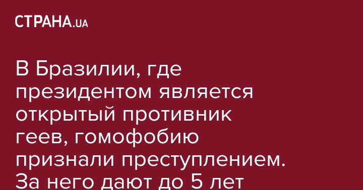 Верховный суд Бразилии признал гомофобию и трансфобию преступлениями. Иррациональный страх перед гомосексуальными мыслями, поведением и людьми 6 из 11 судей приравнять к расизму. Правонарушителям может грозить до пяти лет тюрьмы. Об этом сообщает ВВС