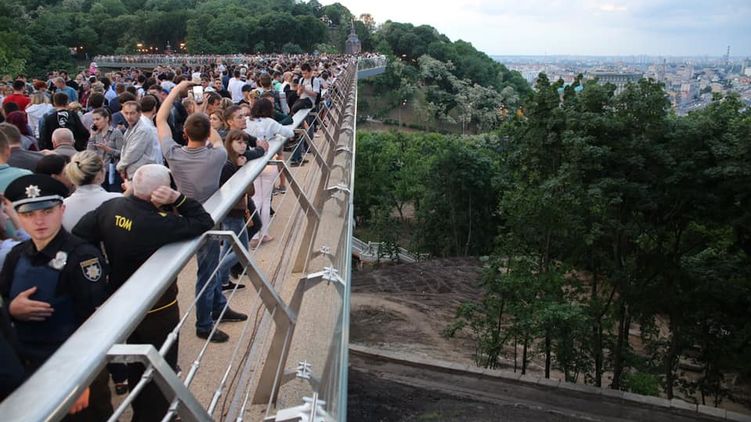 На открытие приехали оба брата Кличко. Они вместе протестировали мост, попрыгав на его стеклянной части. Под которой оказалась вода, которая натекла туда после дождя. "Это заменят", - сказал Кличко.