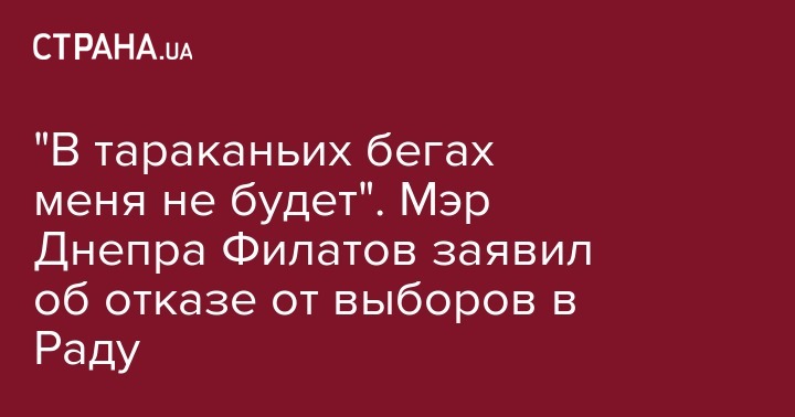 Мэр Днепра Борис Филатов заявил, что не намерен участвовать в парламентских выборах. Об этом он рассказал в своем новом YouTube-блоге, первая запись в котором опубликована 28 мая.