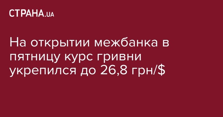 Курс гривни на открытии торгов на межбанковском валютном рынке в пятницу укрепился до 26,8 грн/$1 с 26,935 грн/$1 по итогам торгов в четверг. Об этом сообщает агентство "Интерфакс-Украина" со ссылкой на дилеров коммерческих банков.