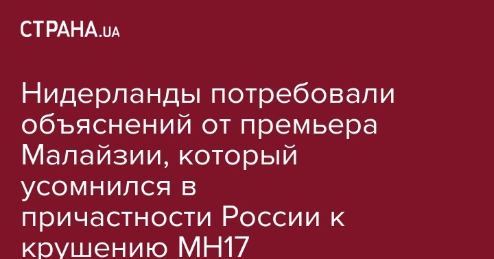 "Правительство Нидерландов обратилось к Малайзии с просьбой разъяснить последние заявления премьер-министра Махатхира Мохаммада. На этой неделе в малайзийских СМИ он поставил под сомнение ответственность России за катастрофу MH17 ", - говорится в сообщении.