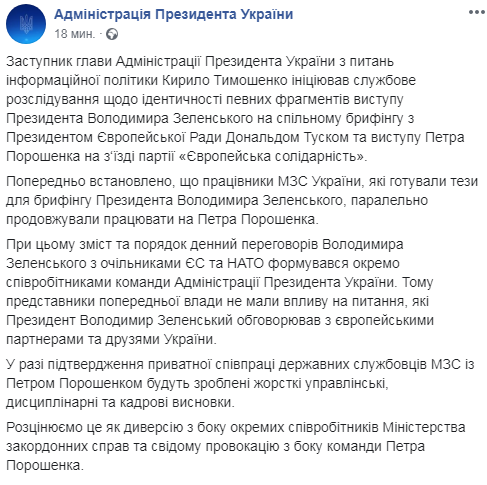 Заместитель главы Администрации президента по вопросам информационной политики Кирилл Тимошенко инициировал служебное расследование относительно идентичности части речи президента Зеленского на совместном брифинге с президентом Европейского Совета Дональдом Туском и выступления Петра Порошенко на съезде партии "Европейская солидарность".