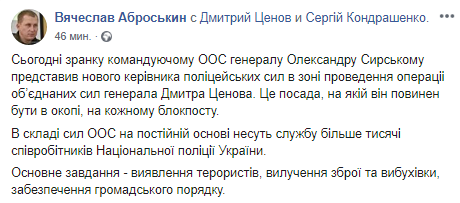 "Сегодня утром командующему ООС генералу Александру Сирскому представил нового руководителя полицейских сил в зоне проведения Операции объединенных сил генерала Дмитрия Ценова. Это должность, на которой он должен быть в окопе, на каждом блокпосту. В составе сил ООС на постоянной основе несут службу более тысячи сотрудников Национальной полиции Украины. Основная задача - выявление террористов, изъятие оружия и взрывчатки, обеспечение общественного порядка", - написал Аброськин.