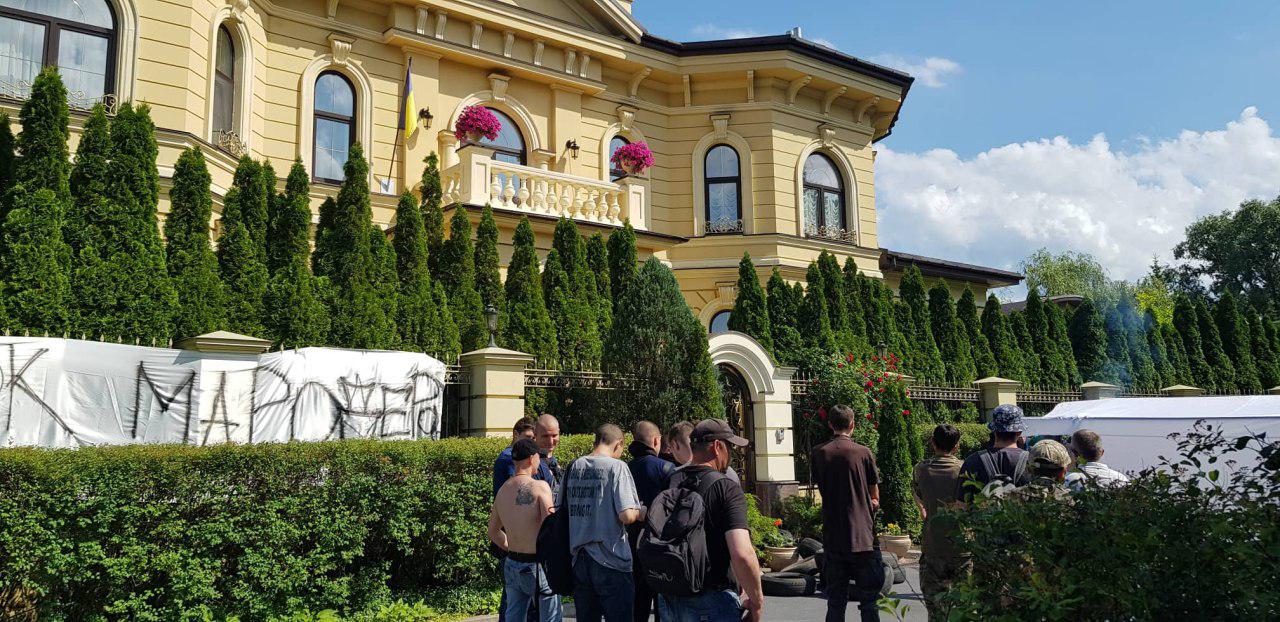 Возле имения отца и сына Гладковских (Свинарчуков) собралось около 30 человек, в основном это молодые парни возрастом 20-30 лет. Все жгут файера, на фасаде дома растянуты плакаты "Дом мародера". Толпа скандирует "Свинарчуков за граты", звучит патриотичная музыка.