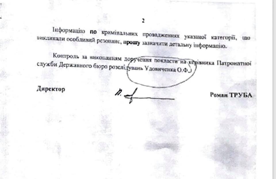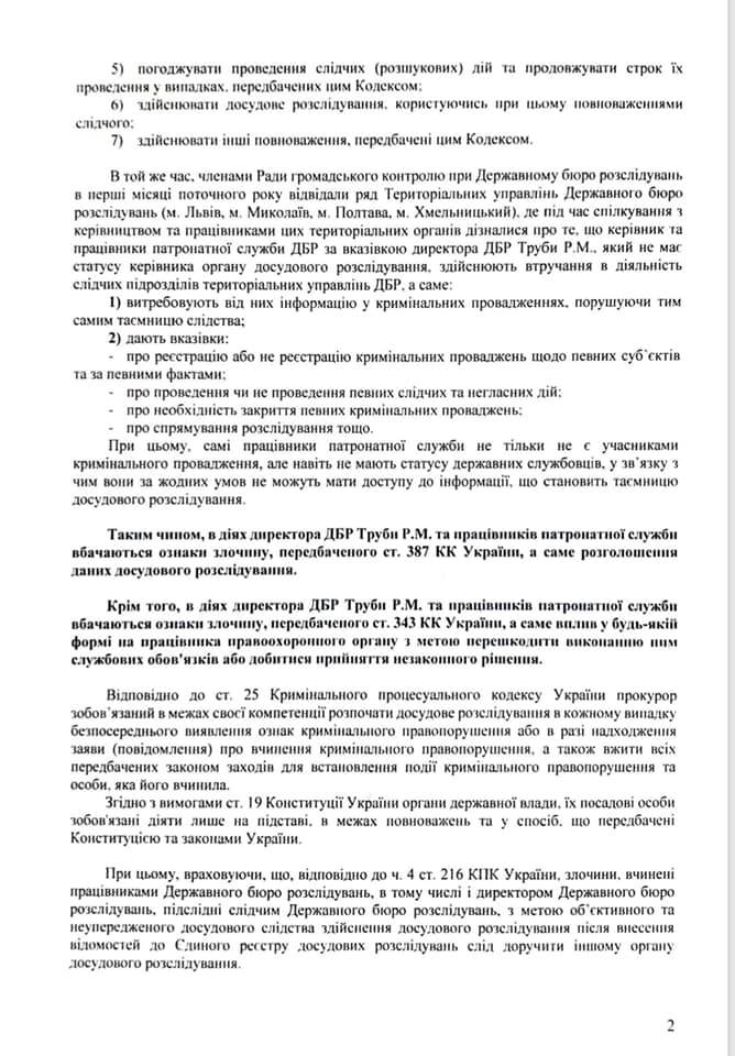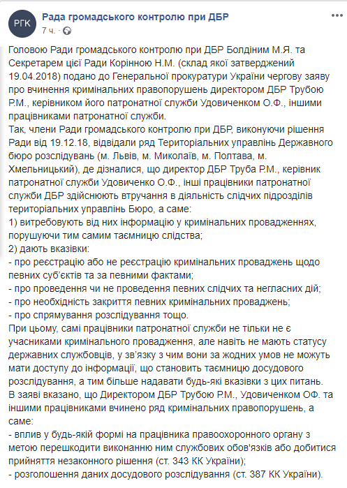 "Члены Совета общественного контроля при ГБР, выполняя решение Совета от 19 декабря 2018 года, посетили ряд Территориальных управлений ГБР (Львов, Николаев, Полтава, Хмельницкий), где узнали, что директор ГБР Труба, руководитель патронатной службы Удовиченко, другие работники патронатной службы ГБР осуществляют вмешательство в деятельность следственных подразделений территориальных управлений бюро", – говорится в сообщении.