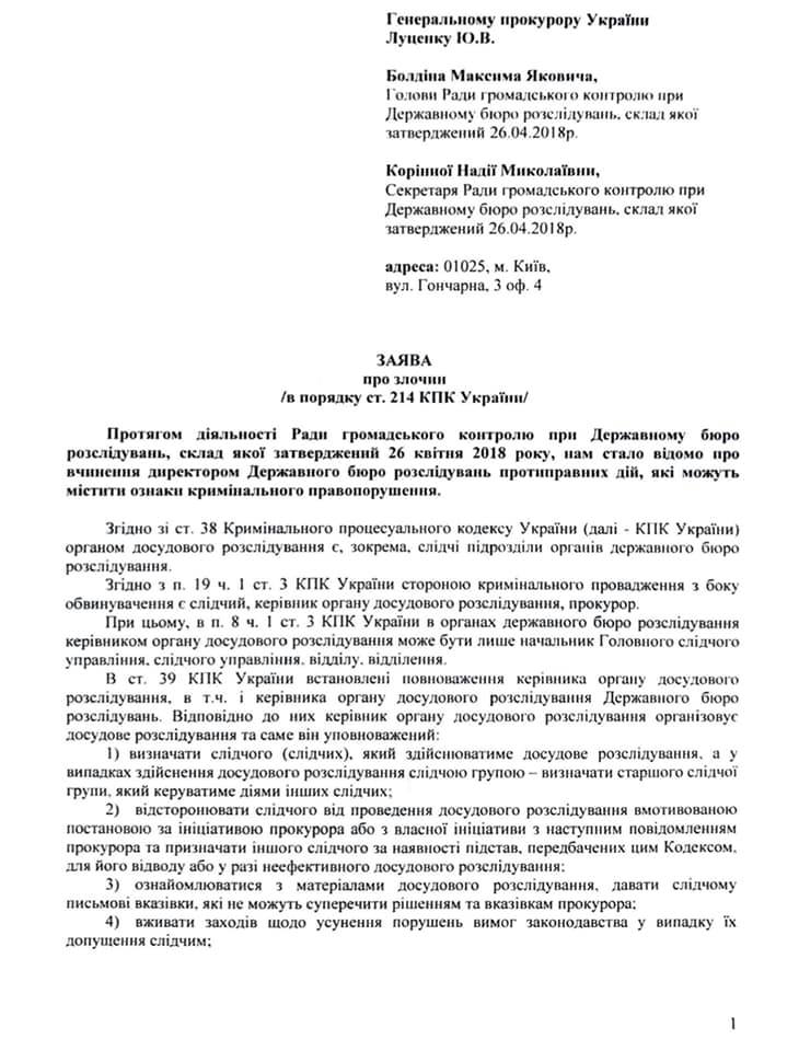 Инициаторами заявления стали глава Совета общественного контроля при ГБР Максим Болдин и его секретарь Надежда Коренная, сообщается на странице органа в Facebook.