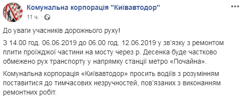 "С 14:00 6 июня в связи с ремонтом плиты проезжей части на мосту через реку Десенка будет частично ограничено движение транспорта в направлении станции метро "Почайна", - отмечается в сообщении.