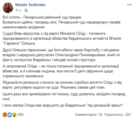 "Буквально только что посреди ночи, Печерский суд на скорую руку провел неанонсированное заседание. Судья Вовк отпустил из-под стражи Михаила Сигиду – главного подозреваемого в организации убийства бердянского активиста Виталия "Сармата" Олешко", – написала Наталья Седлецкая.