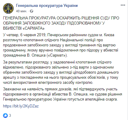 "Ввиду наличия прямых доказательств, подтверждающих участие подозреваемого в организации убийства Олешко, на судебное решение Генеральной прокуратурой Украины готовится апелляционная жалоба", - сказано в сообщении ГПУ в Facebook.