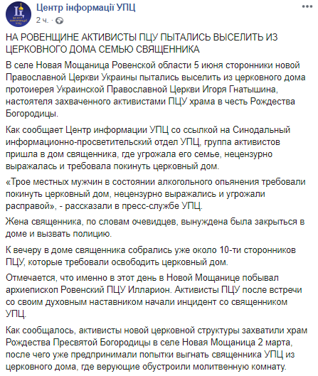 В селе Новая Мощаница Ровенской области сторонники Православной церкви Украины (ПЦУ) пытались выселить из церковного дома протоиерея Украинской православной церкви (УПЦ) Игоря Гнатышина, настоятеля храма в честь Рождества Богородицы, захваченного активистами ПЦУ. Инцидент произошел 5 июня, сообщает центр информации УПЦ на своей странице в социальной сети Facebook.