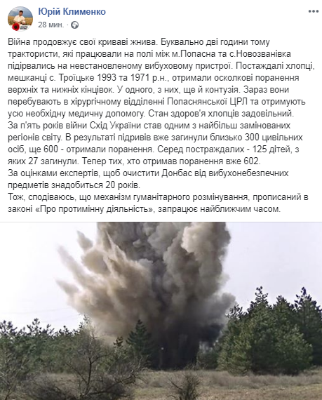 "Буквально два часа назад трактористы, которые работали на поле между г.Попасная и с.Новозвановка подорвались на неустановленном взрывном устройстве. Пострадавшие ребята, жители с.Троицкое 1993 и 1971 г.р., получили осколочные ранения верхних и нижних конечностей. У одного из них еще и контузия", - написал Клименко.