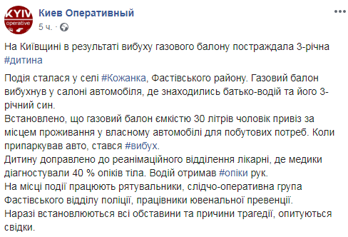 В селе Кожанка Киевской области в результате взрыва газового баллона пострадала 3-летний ребенок. Об этом сообщает Киев Оперативный.