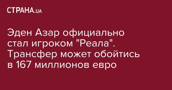 Полузащитник "Челси" и сборной Бельгии Эден Азар подписал контракт с мадридским "Реалом". Переход бельгийского полузащитника обошелся мадридскому клубу в 100 миллионов евро без учета возможных бонусов. Об этом сообщает пресс-служба Реала. О трансфере было объявлено 7 июня.