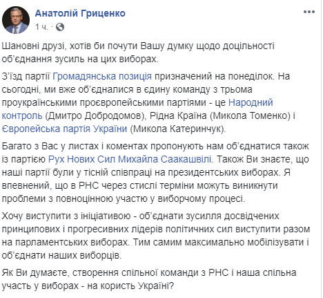 Лидер "Гражданской позиции" Анатолий Гриценко спросил в соцсети мнения украинцев об объединении с партией Михаила Саакашвили "Рух новых сил". Об этом он сообщил в Facebook.