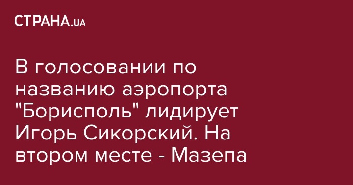 Как сообщала "Страна", началось онлайн-голосование за новое имя для аэропорта "Борисполь". Напомним, что предлагается на выбор пять вариантов имен известных личностей. Два часа назад лидером голосования и был вариант "Игорь Сикорский", на втором месте был "Иван Мазепа", на третьем - Казимир Малевич".