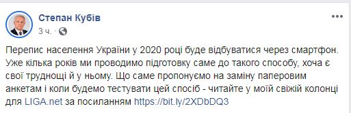 Перепись населения Украины в 2020 году будет проходить через смартфон. Об этом первый вице-премьер-министр Украины-министр экономического развития и торговли Украины Степан Кубив написал на своей странице в Facebook.