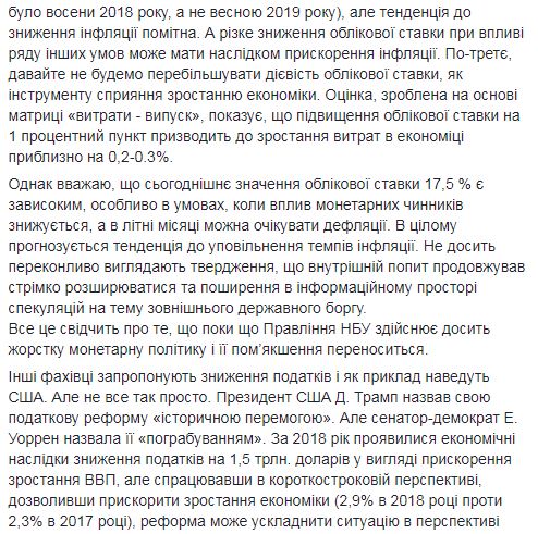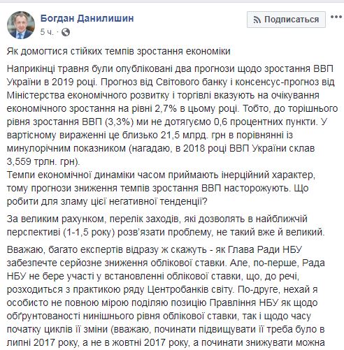 Данилишин также сообщил, что Совет НБУ не принимает участие в установлении учетной ставки, что, расходится с практикой ряда центробанков мира. По его оценке, начинать повышать учетную ставку нужно было в июле-2017, а не в октябре-2017, а начинать снижать можно было осенью 2018 года, а не весной 2019 года.