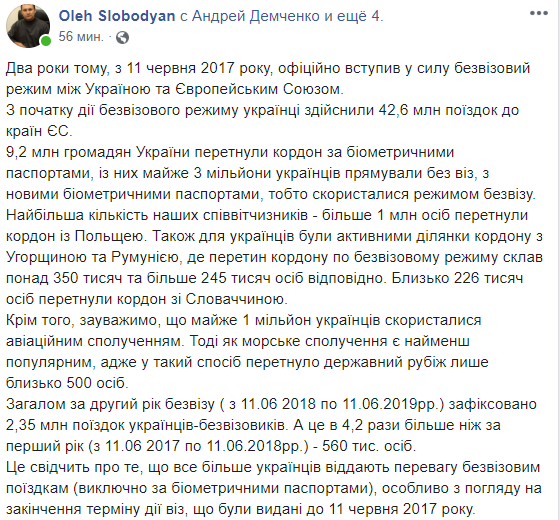"9,2 млн граждан Украины пересекли границу с биометрическими паспортами, из них почти 3 миллиона украинцев направлялись без виз, с новыми биометрическими паспортами, то есть воспользовались режимом безвиза", – сообщил Слободян в соцсети.