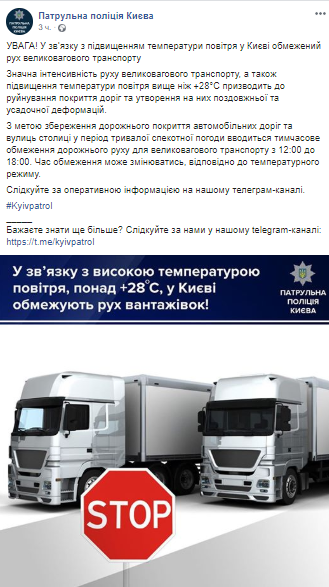 В Киеве из-за повышения температуры воздуха ввели временное ограничение дорожного движения для тяжеловесного транспорта. Об этом сообщается на странице патрульной полиции Киева в Facebook.