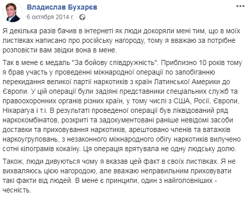 По словам чиновника, его наградили 10 лет назад за участие в международной операции по предотвращению переправки крупной партии наркотиков из стран Латинской Америки в Европу. В этой операции, по словам Бухарева, были задействованы представители спецслужб разных стран, в том числе США, России, Европы, Никарагуа.