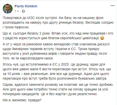 "Немного досадно выступать в роли разрушителя мифов и говорить людям правду после того, как им нарассказывали сказок. Кто-то слышал, что будем вступать в ЕС в 2025. Это глупости, ведь для этого уже давно должны бы вести переговоры о вступлении. Кто-то слышал, что через 10 лет - уже реальнее, но все еще глупость. Ведь для этого переговоры о вступлении надо было начинать буквально завтра", - написал Климкин.