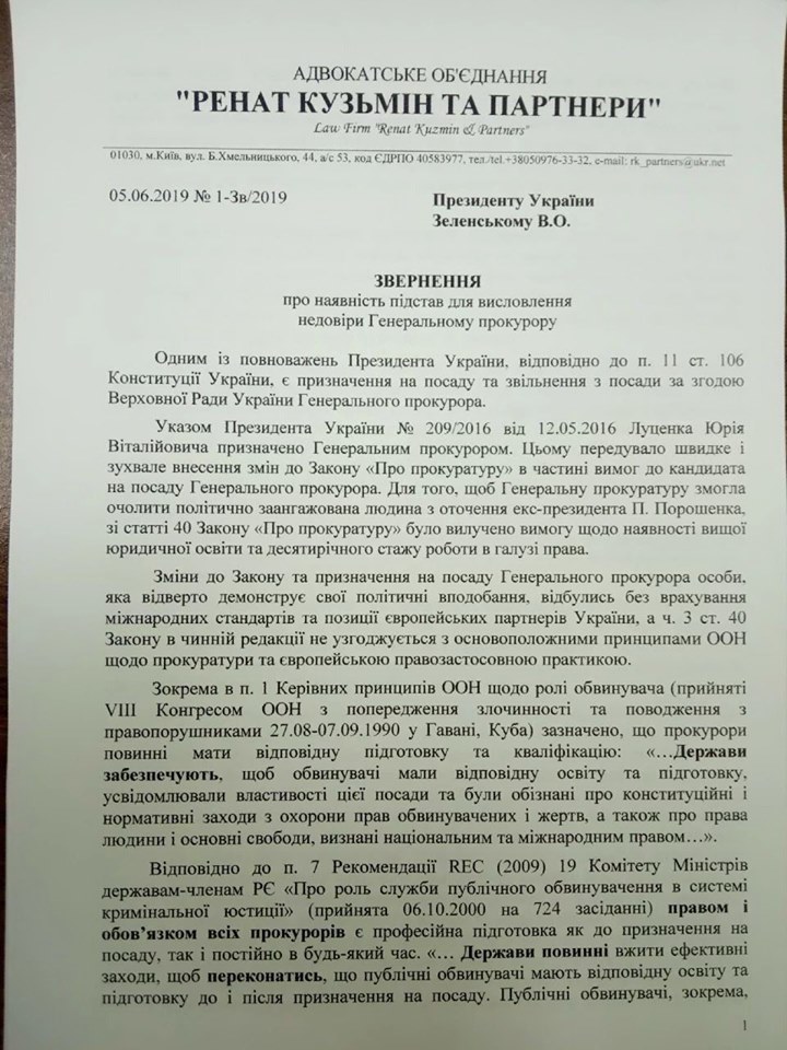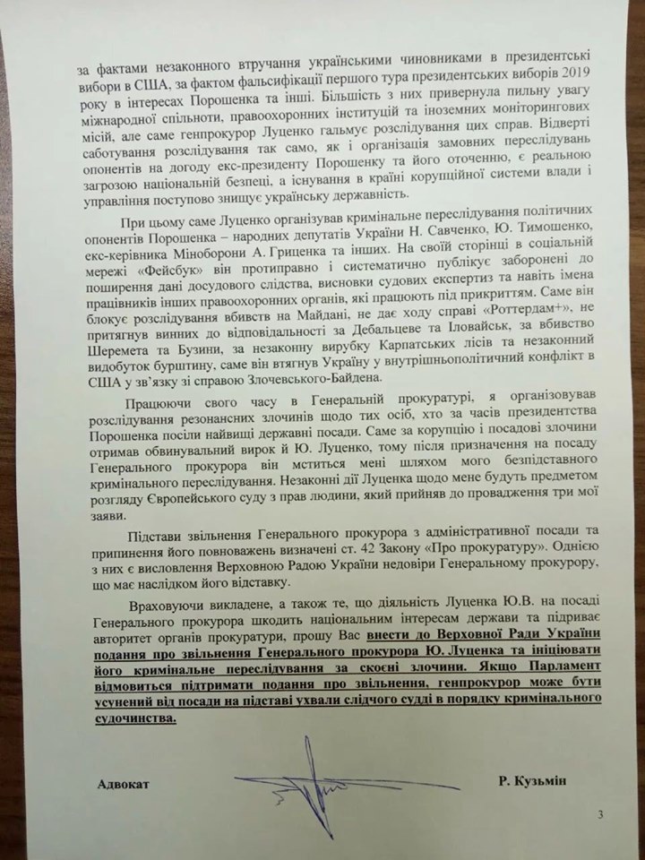 Он предлагает сравнить тексты своего обращения к президенту и обращения Зеленского к Раде. "Как видите, в Раду направлен коротенький, мягко говоря, документ без глубокого анализа украинского и международного законодательства, правоприменительной практики и доктрины, без ссылки на основания для увольнения генпрокурора, исчерпывающий перечень которых указан в законе и не подлежит расширенному толкованию", - подчеркивает Кузьмин.