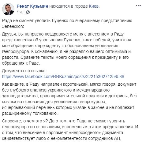 "Друзья, вы напрасно поздравляете меня с внесением в Раду представления об увольнении Луценко, как с победой, учитывая мое обращение к президенту с обоснованием увольнения генпрокурора. К сожалению, я не разделяю вашего оптимизма и радости", - пишет Кузьмин.
