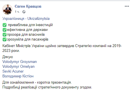В среду, 12 июня, на заседании правительства утвердили Стратегию АО "Укрзализныця" на 2019-2023 гг. Об этом сообщил глава ведомства Евгений Кравцов на своей странице в соцсети.