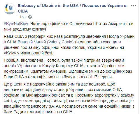 "Это решение является чрезвычайно важным и дает толчок исправить официальное название столицы Украины и за пределами США, в частности на международных рейсах и в иностранных аэропортах во всем мире, ведь международные организации, включая Международную ассоциацию авиационного транспорта (IATA), ссылаются именно на официальные названия из базы Совета по географическим названиям США", - пояснили  в посольстве.