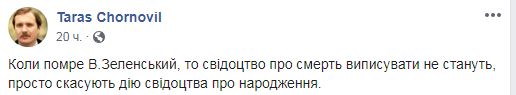 Известный политик, сторонник экс-президента Петра Порошенко Тарас Черновол решил пошутить о роспуске Верховной Рады, связав это событие со смертью президента Владимира Зеленского. Свой пост он разместил в Facebook.