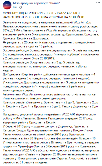 В сообщении говорится, что такие планы связаны с популярностью указанных направлений авиакомпании из/во Львов, среднемесячная загруженность которых в 2019 году составляет 83%.