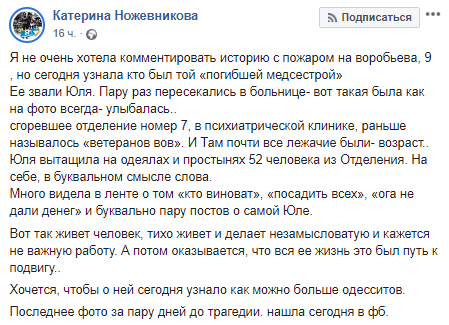"Ее звали Юля. Пару раз пересекались в больнице - вот такая была как на фото всегда - улыбалась... Сгоревшее отделение №7 в психиатрической клинике раньше называлось "Ветеранов ВОВ". И Там почти все лежачие были - возраст... Юля вытащила на одеялах и простынях 52 человека из отделения. На себе, в буквальном смысле слова", - написала Екатерина Ножевникова.