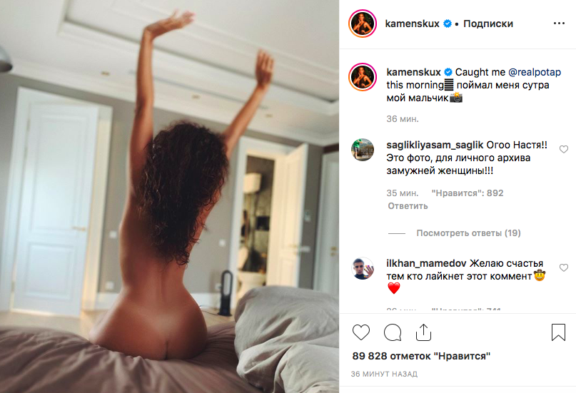 Подписчики прокомментировали голое фото Каменских так (орфография и пунктуация сохранены): "Огоо Настя!! Это фото, для личного архива замужней женщины!!!", "Фигура огонь! Только зачем это выкладывать? Это же не порножурнал!", "В трусах было бы не менее красиво и не так дешево смотрелось бы", "опасно, СМИ будут удивлены".