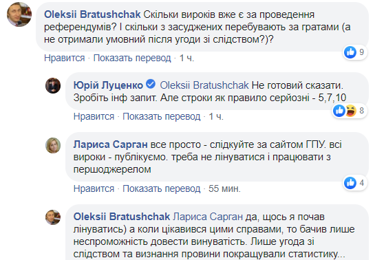 Кроме того генпрокурор не смог ответить, сколько приговоров уже было в Украине за проведение незаконных референдумов, заявив, что "сроки серьезные". На что журналист Алексей Братущак посетовал, что как правило сроки номинальные, а с обвиняемыми заключается сделка.